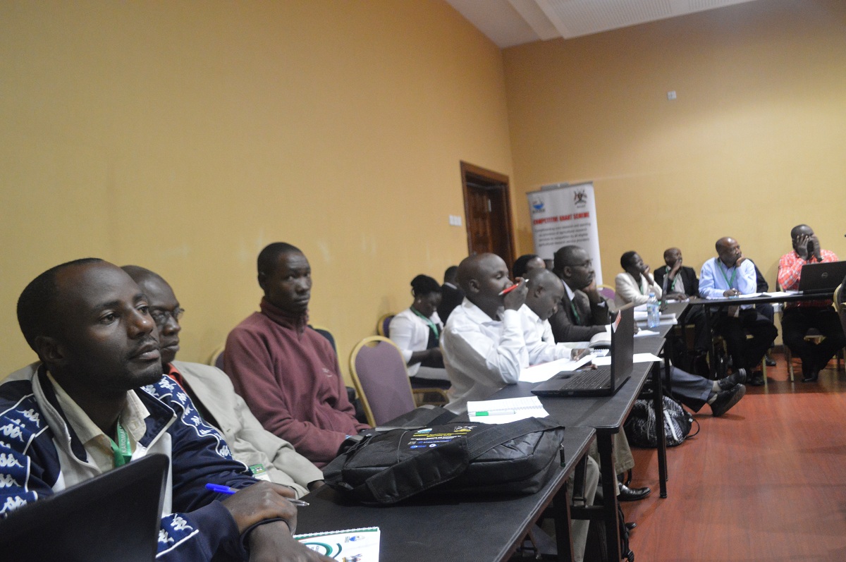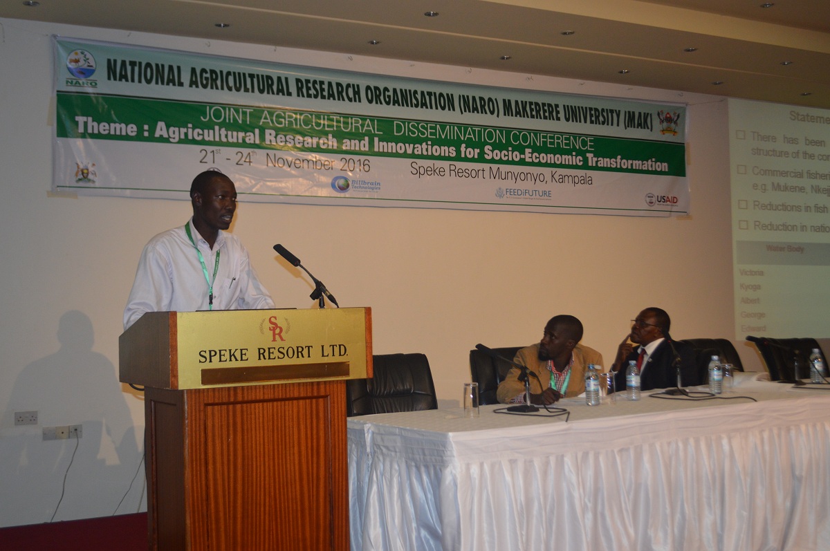 NaFIRRI scientist Mr. Herbert Nakiyende presenting at NARO-MAK joint agricultural dissemination conference.